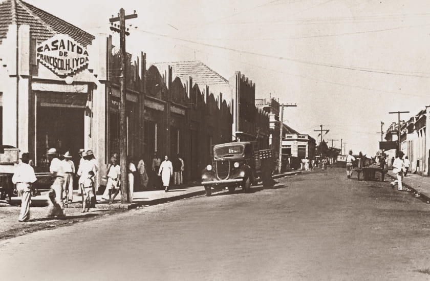 “Casa Iyda de Francisco H. Iyda” na década de 1930. A fundação de Promissão está ligada à história da imigração japonesa no Brasil e à expansão da malha ferroviária na região. Ali ficava, desde 1908, a estação denominada Hector Legru, nome do banqueiro que financiou a construção da Noroeste do Brasil, por onde chegaram imigrantes de várias origens, mas muitos japoneses, na terra promissora, nomeada de Promissão em 1921. A comunidade nipônica, que se consolidou na região durante as décadas de 1920 e 1930, trabalhava na agricultura e nas vendas. Os estabelecimentos comerciais locais eram em sua maioria térreos, com portas abertas para a rua e decorados por ornamentos variados em relevo, de padrões geométricos, seguindo, à moda da época, as referências e as conexões possibilitadas pelos trilhos.