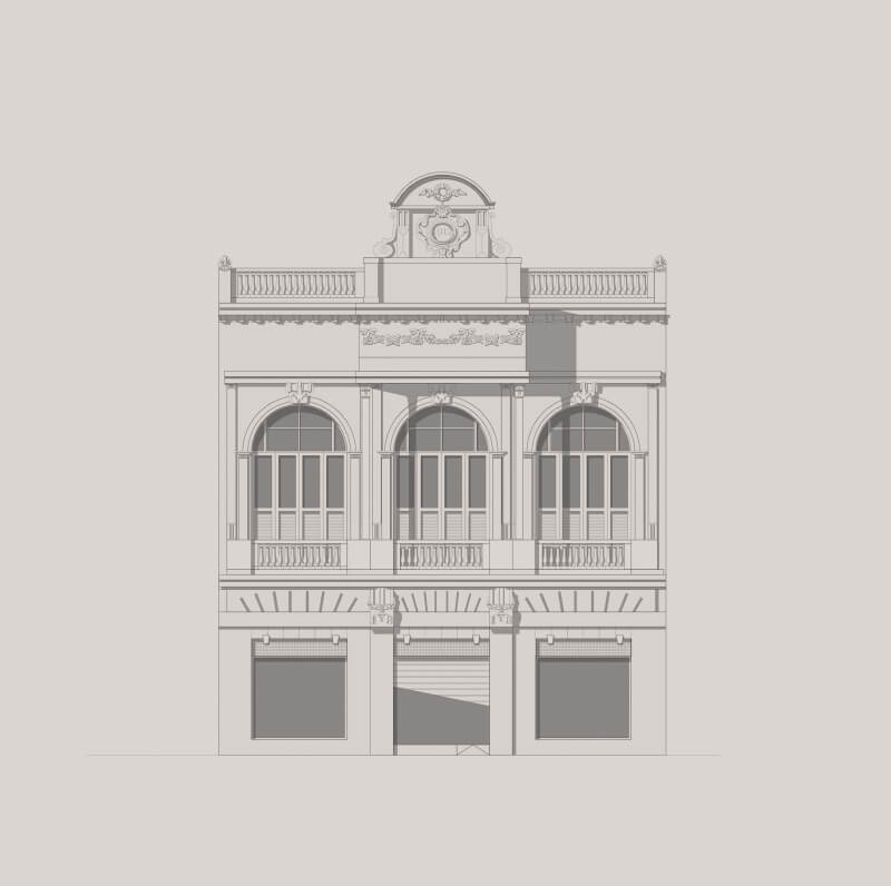 Suas portas permanecem abertas para atendimento no nível da rua. Apresenta, ainda, sacadas no andar superior com balaústres e aberturas em arco pleno. A ornamentação apresenta folhas de acanto, flores e fitas em relevo. O frontão com coroamento central tem impressa a data de sua construção: 1912.