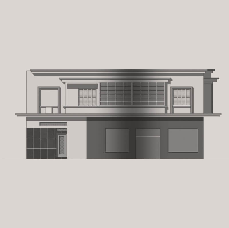 A edificação tem à sua frente uma ampla calçada e um pequeno largo. Chama a atenção a curvatura côncava na fachada principal, que contribui para o ambiente de pátio na frente da loja e ao mesmo tempo acolhe pedestres. A platibanda que esconde o telhado, os frisos e as molduras retos marcando as lajes e contornando as aberturas, as esquadrias metálicas e as venezianas de madeira, as marquises e o embasamento de pedra bruta do térreo compõem características das construções urbanas em processo de modernização na metade do século XX.